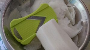 ダイコンは(またしても)100均のスライサーでサクサクと薄切り。
