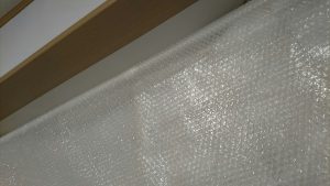 こんな感じ。つっぱり棒にぷちぷちを掛けるだけ。