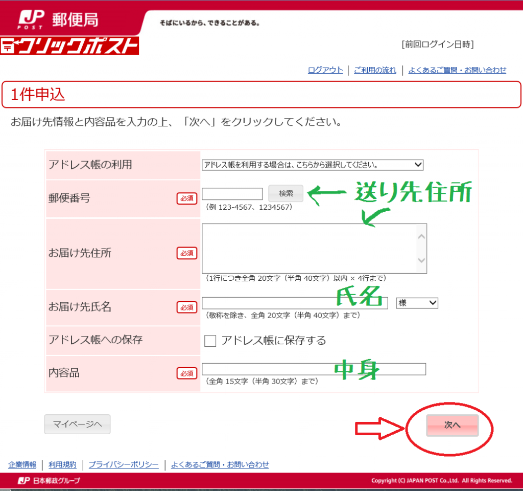 自分の住所は入力しなくてOK(ヤフーID登録住所)