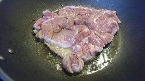 で、油は入れずに皮目からフライパンに広げる。