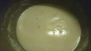 ミキサーしたえのきを鍋にかけて1時間程度弱火で煮詰める