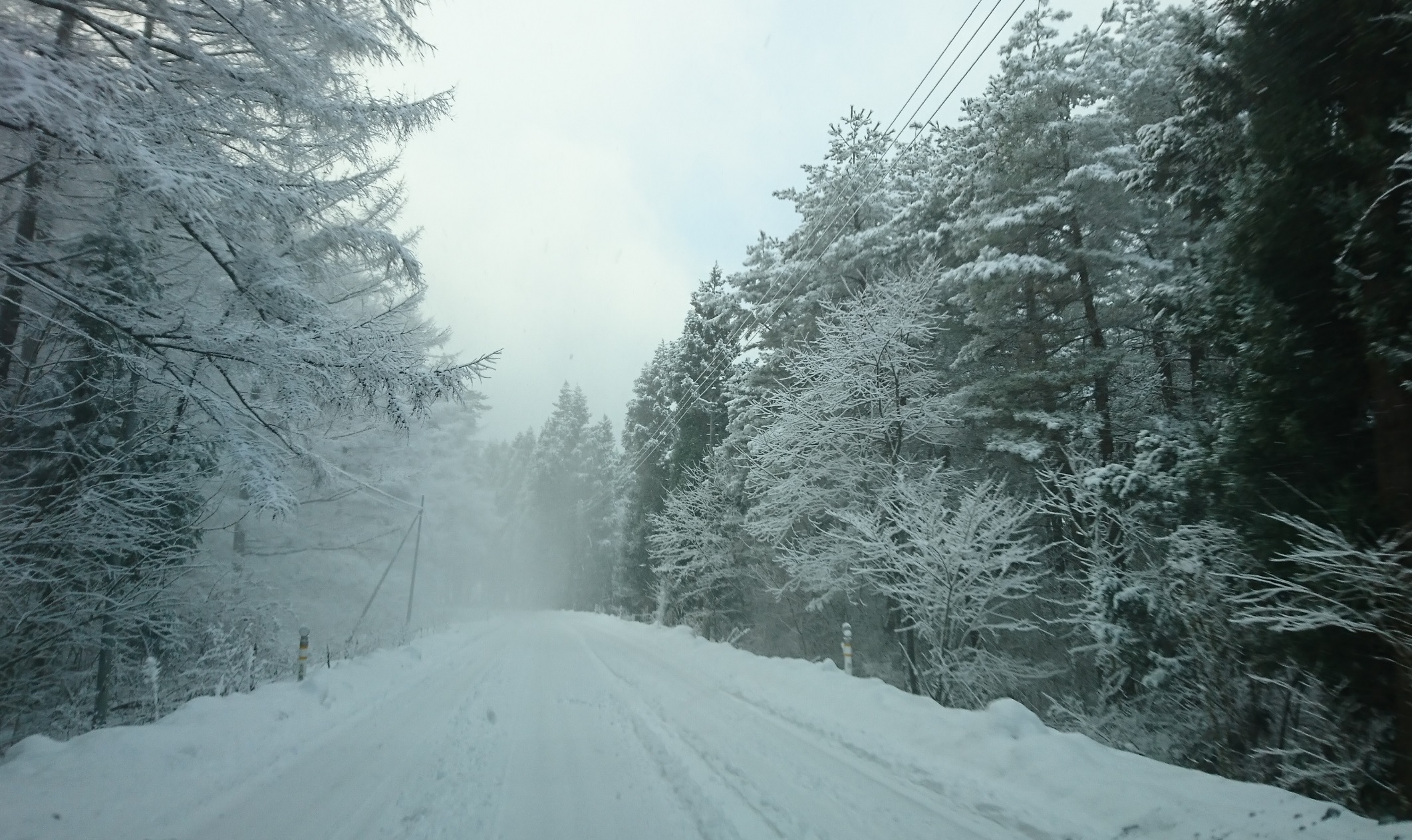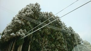 電線に雪が積もって白くなる。